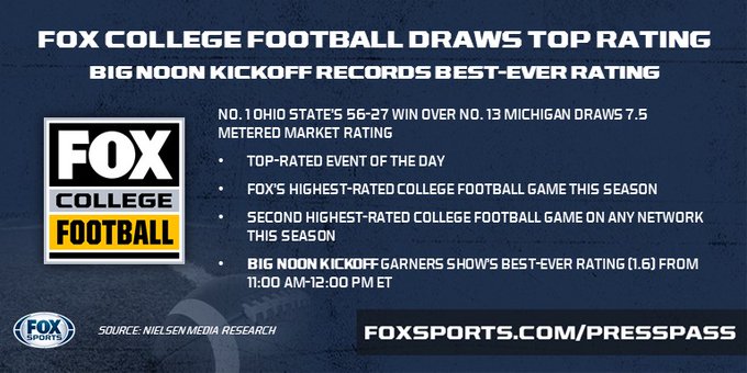 FOX College Football’s coverage of top-ranked Ohio State’s win over Michigan checks in as the highest-rated event of the day, the network’s top-rated college football game this season and pulls in BIG NOON KICKOFF’s best rating ever