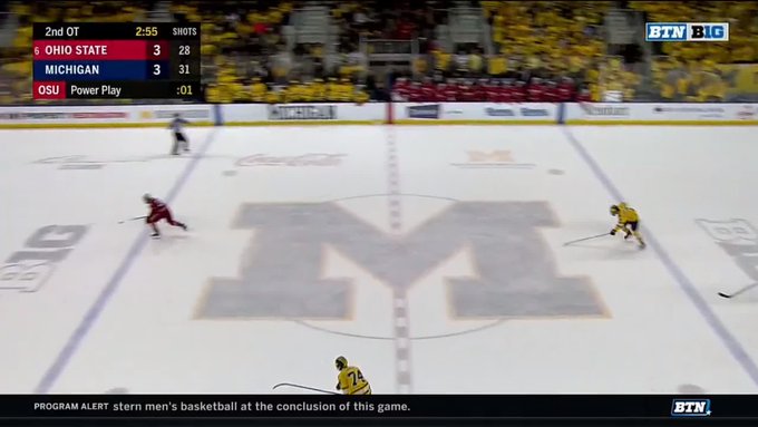 Halfway through the third period,, the Wolverines netted their last goal of the match. While Ohio State was not able to score any goals in the period, it was able to kill a major penalty in the last five minutes despite being down a player, securing the Buckeyes a tie game at the end of regulation,